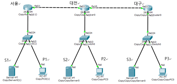 => 남은 네트워크는 서울-대전 네트워크와 대전-부산 네트워크가 남고, 각 네트워크는 각 Router의 IP 2개와 네트워크 ID와 Direct Broadcast 2개가 필요하므로 총 4개의 IP가 각각 필요하다. 남은 IP의 개수는 64개이고, 25 (=32) > 4 Host이므로 각 네트워크에 25 (=32) 개의 IP를 할당하면 된다.