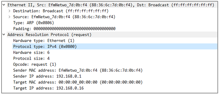 - Target MAC Address를 모르기 때문에, 00:00:00:00:00:00으로 입력되어 있다.