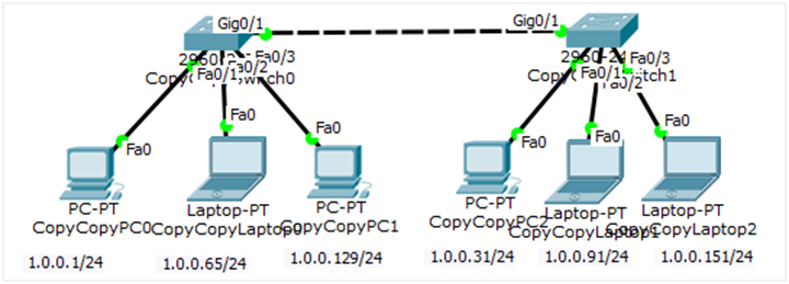 - Trunk로 연결해야 Switch 통신이 가능해진다(1.0.0.1 PC)