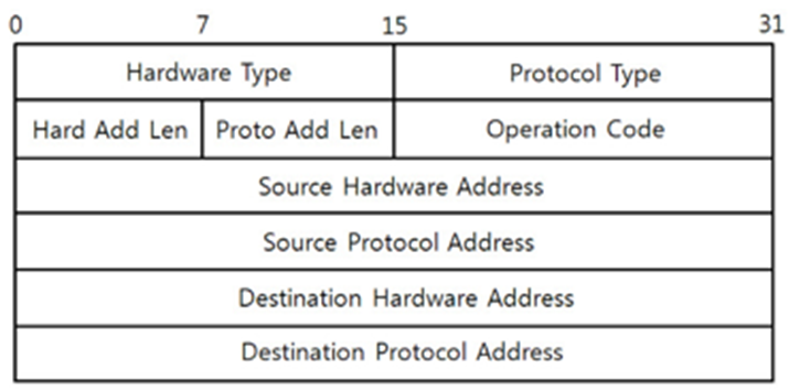 - Operation Code: ARP의 동작, ARP Request, ARP Reply, RARP Request, RARP Reply
