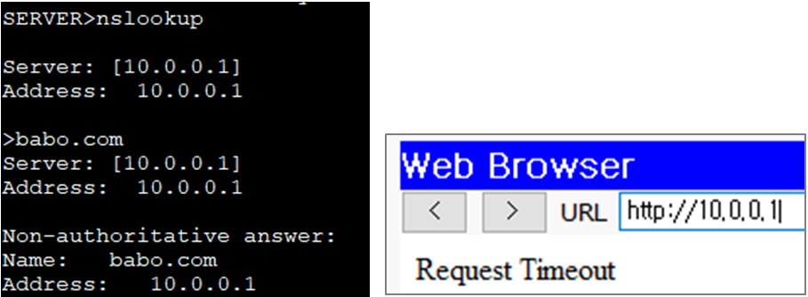- Web Browser에서는 Request Timeout이 되지만, nslookup을 통해서 DNS가 확인되는 것을 볼 수 있다.