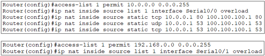 - ip nat inside source list 1 interface Serial0/0 overload: Inside Interface에서 처리하며, Inside Interface로 정의한 Interface로 Source IP가 list 1을 만족하는 IP를 Destination에 속한 Serial0/0의 IP로 변환 / Overload = PAT 적용