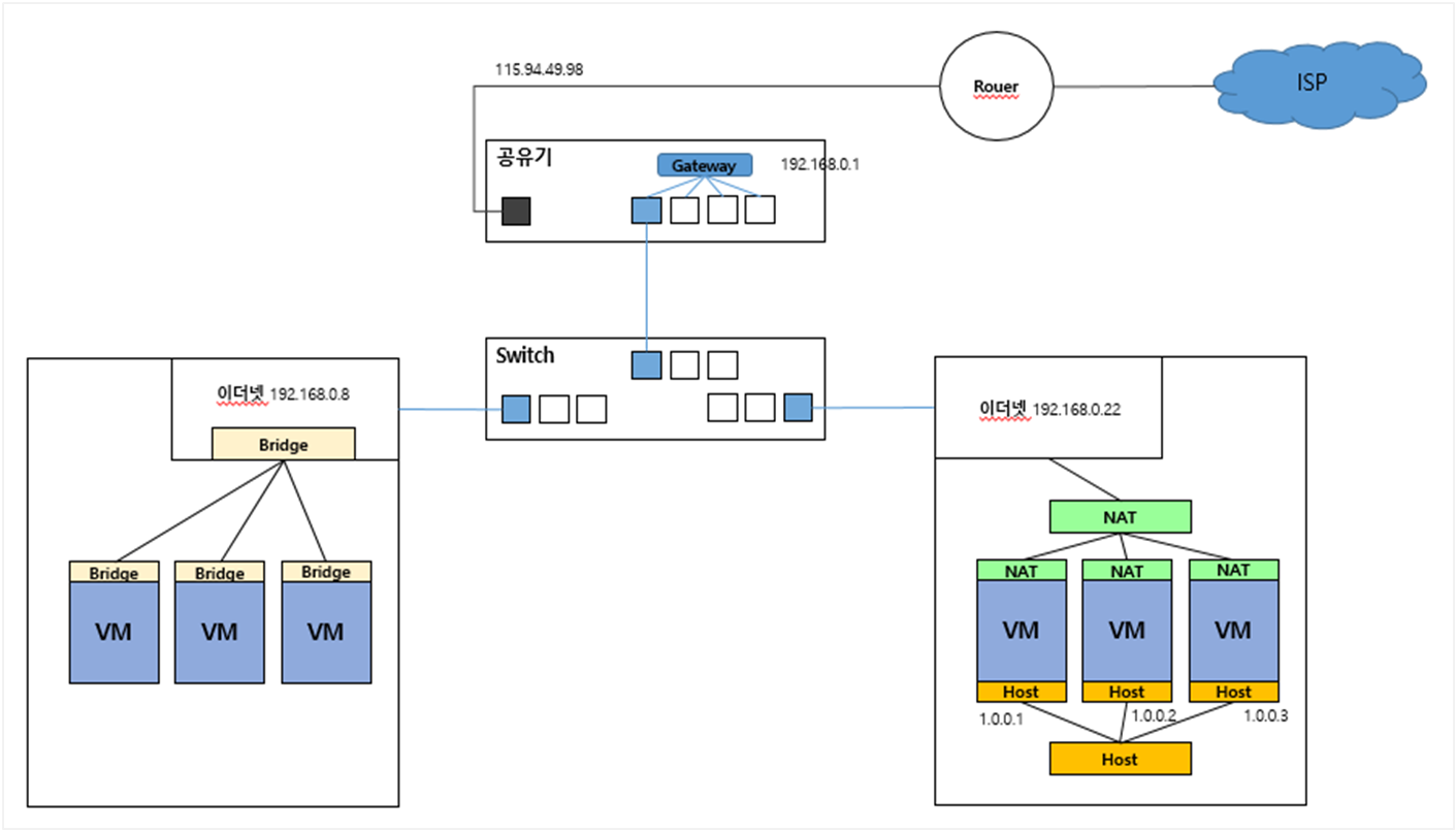 - VMnet 0 Bridge: 실제 물리적인 카드(네트워크 어댑터)를 빌린다. 그렇기 때문에 같은 대역의 IP로 설정해야 한다. 1, 8번 기능을 모두 할 수 있는 만능이지만, 실제 카드를 사용하기 때문에 성능 저하를 일으키고, 외부에 노출되어있기 때문에 보안이 취약하다.