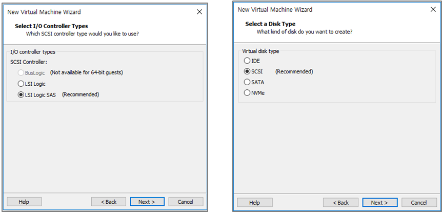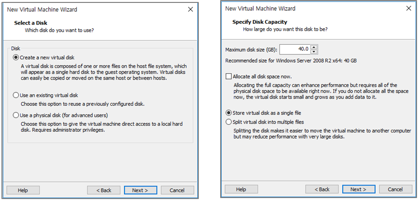 - Virtual Disk 선택: 새로 생성 / 기존 Virtual Disk 사용 / 실제 Disk 사용