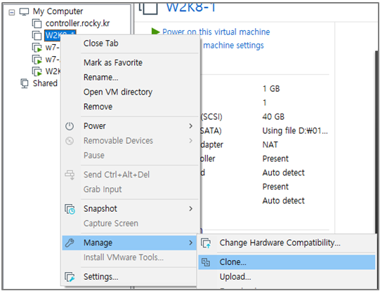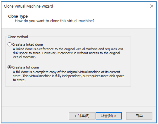 : Original Virtual Machine을 참조하여(링크로 연결) Clone 생성. 링크로 연결되어 있기 때문에 적은 공간을 사용하지만, Original에 문제가 발생 시 영향을 받는다.