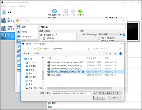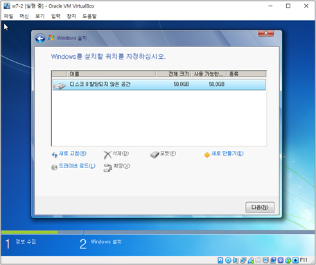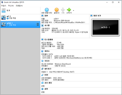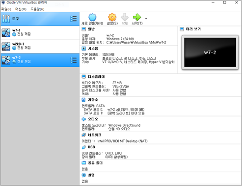 8. 좌측 목록에 ‘w7-2’ 이름의 Virtual Machine 생성