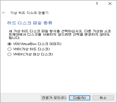 - 3가지의 파일 종류. 여기서는 VirtualBox를 사용하므로 VDI 선택