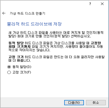 1) 동적 할당: 바로 설정 크기로 할당되는 것이 아니라 Virtual Machine에서 사용하는 용량이 커질 때마다 크기가 최대 설정크기까지 커진다. 디스크 용량을 아낄 수 있다.