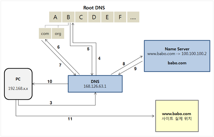 - 8, 9번: babo.com Name Server에서 www.babo.com의 IP 주소를 확인한다.