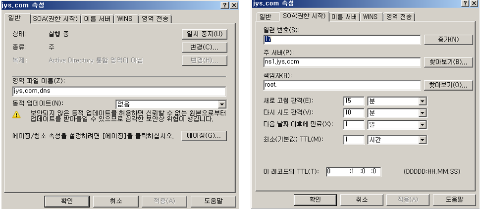 - recursion : 순환한다는 의미로, Yes로 설정하면 네임 서버에 설정되지 않은 도메인에 대한 질의가 있을 시 캐싱 네임서버의 역할을 하여 DNS(외부) 질의 과정을 거치게 된다. 주 네임 서버는 캐싱 네임서버 역할이 필요하지 않으므로 여기서는 No로 설정.