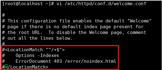- /etc/httpd/conf.d/welcome.conf : 기본 화면 페이지 <LocationMatch> ~ </LocationMatch>를 주석 처리한다.