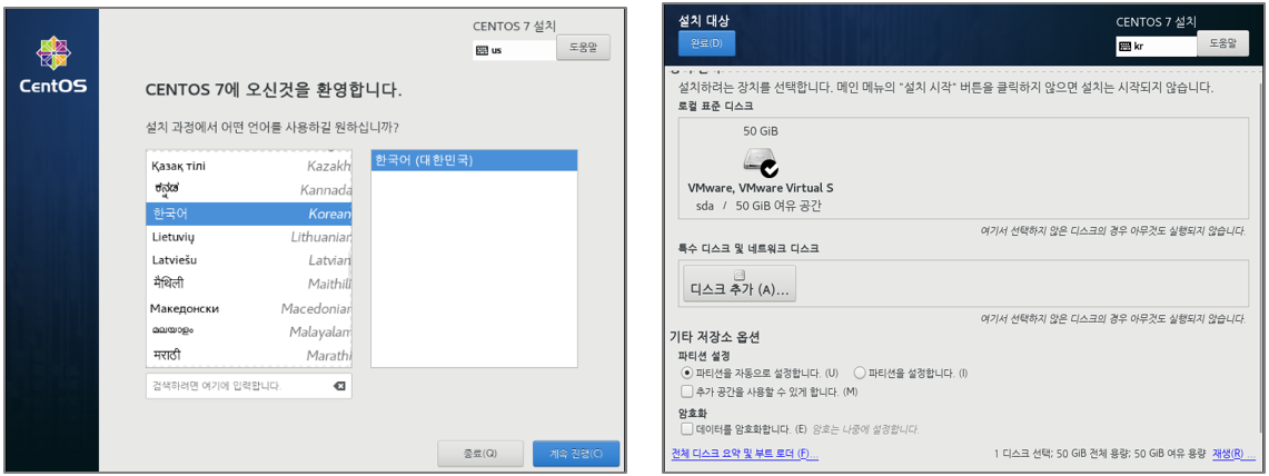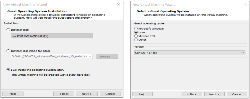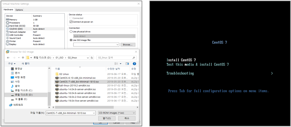 - Edit virtual machine settings (Virtual Machine Settings) -> Image file 추가(CentOS 7 64bit 선택)