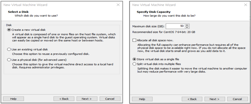 - Disk Size 50GB로 설정, 하나의 파일로 관리하기 위해 Store virtual as a single file 선택