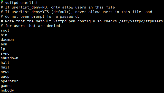 - /etc/vsftpd/ftpusers에 설정되어 있는 user들에 대해서 deny(거부)하겠다는 의미이다.