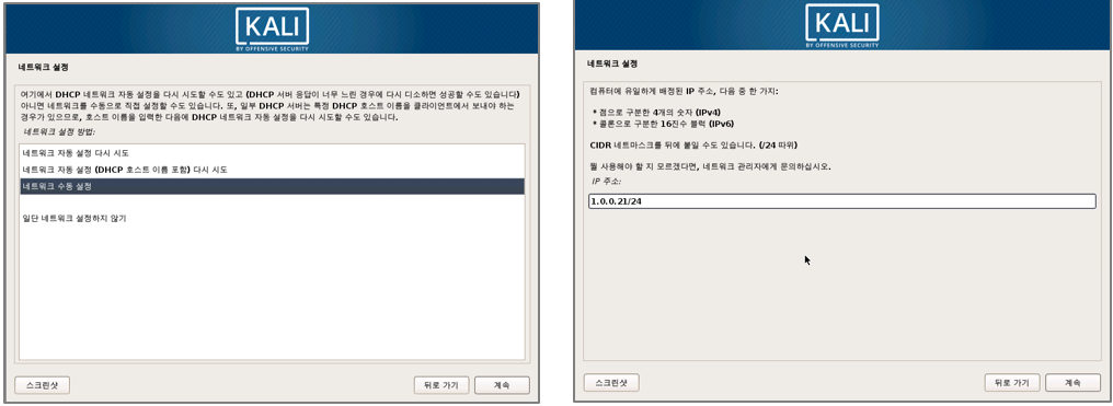 - 해당 네트워크에 DHCP가 없으면 설정이 안 되므로 수동으로 설정해야 된다.
