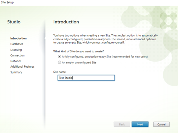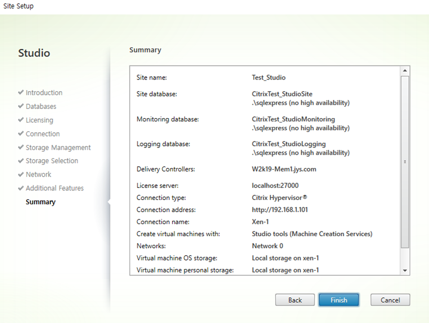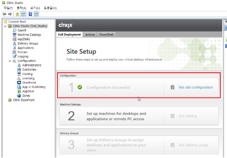 - Site는 Citrix 가상 애플리케이션 및 데스크톱 배포를 위한 관리단위. 이는 Delivery Controller 및 기타 핵심 구성 요소, VDA (Virtual Delivery Agents), Host, Computer Catalog 및 Delivery Group에 대한 연결로 구성된다. 핵심 구성 요소를 설치한 후, 첫 번째로 Computer Catalog 및 Delivery Group을 만들기 전에 Site를 만들어야 된다.