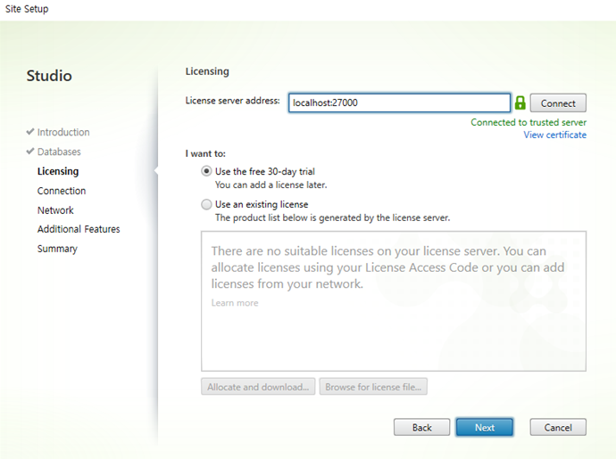 - License Server address 설정, License가 없으므로 30일 무료로 선택