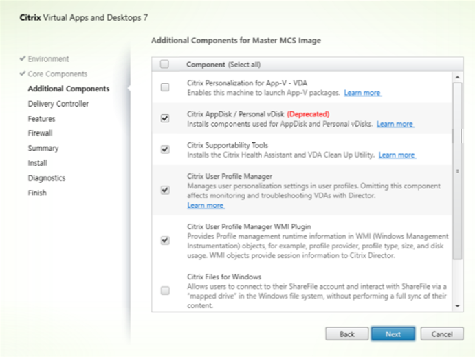 5) MCS IO: MCS를 사용하여 VM을 Provisioning 할 때만 유효. 이 옵션을 선택하면 MCS IO 쓰기 캐싱 드라이버가 설치된다.