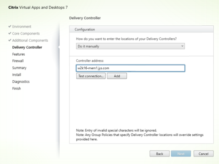 - Delivery Controller 연결, 수동 선택, Controller address 입력(FQDN 입력)