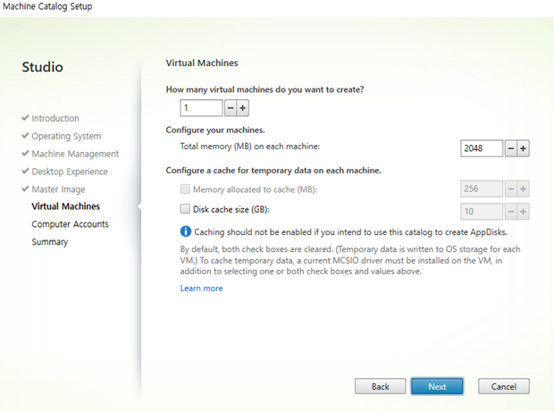 => 생성된 각 VM에는 하드 디스크가 있습니다. 크기는 마스터 이미지에서 설정된다. 카탈로그의 하드 디스크 크기는 변경할 수 없다.
