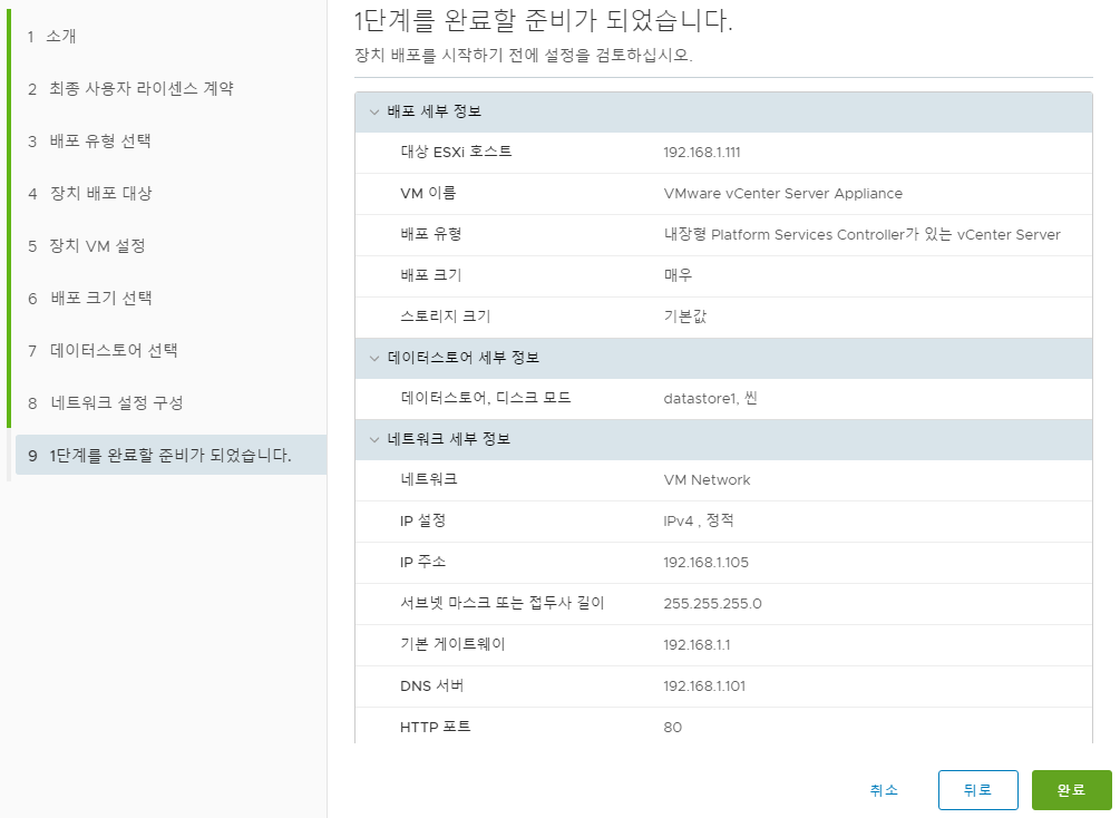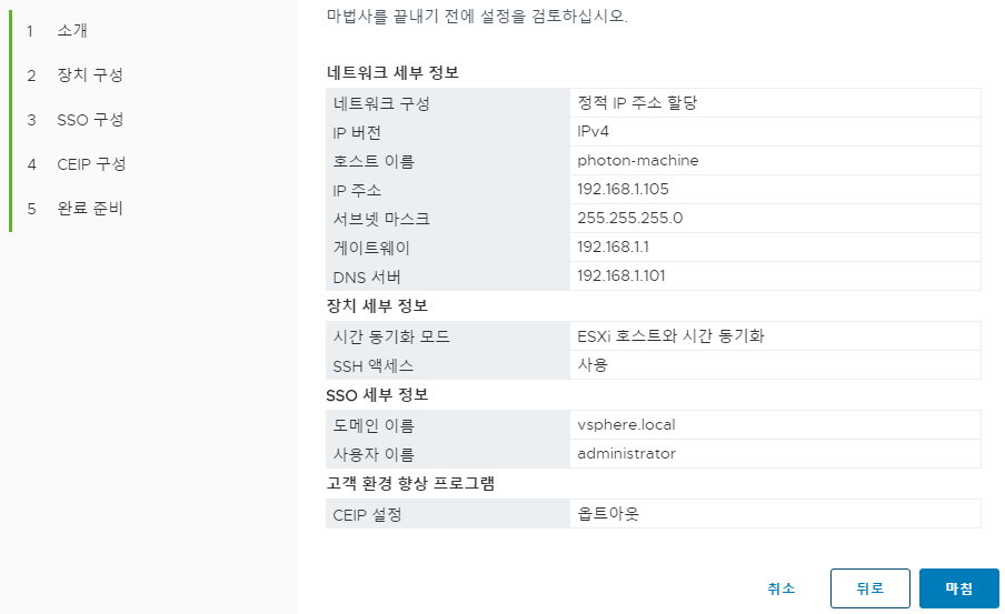 - VMware CEIP(고객 환경 향상 프로그램)에 참여 여부, 체크 해제