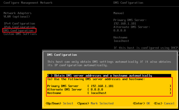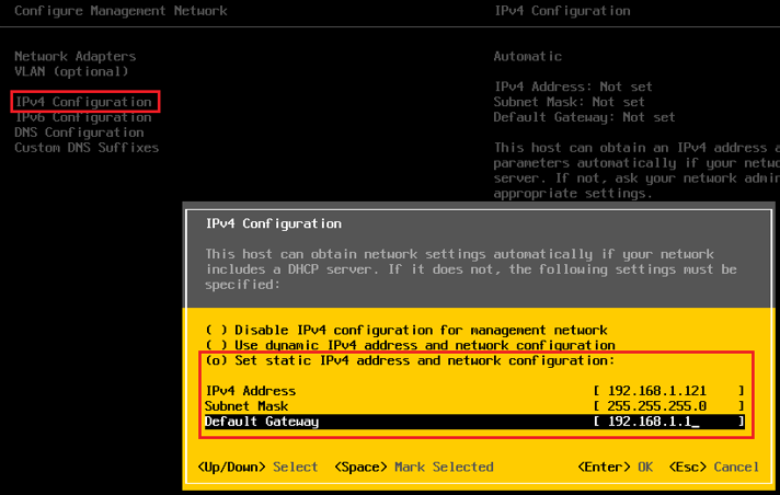 - Configure Management Network -> IPv4 Configuration, IPv4 설정