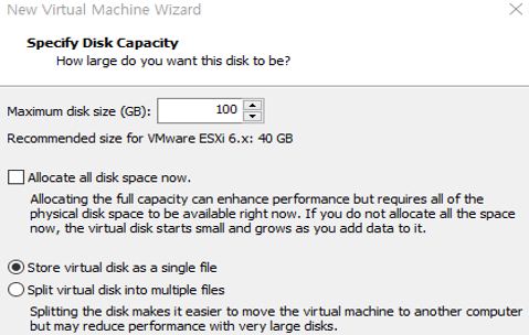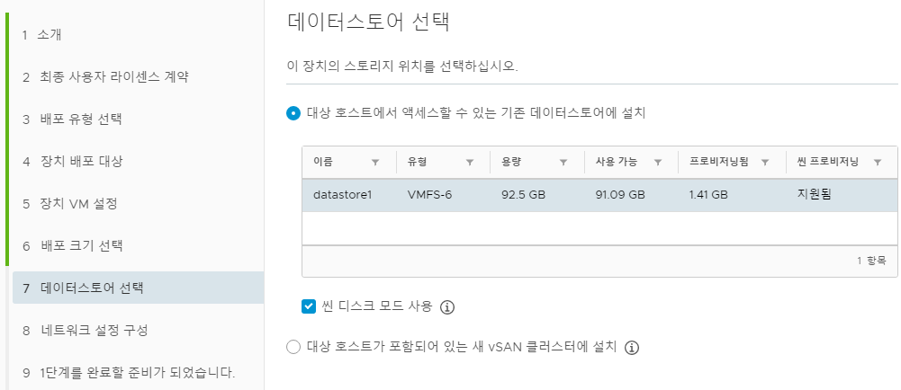 - 배포될 Datastore 선택, 기존 Datastore에 설치(씬 디스크 모드는 크기가 여유로우면 체크를 해제해도 된다)