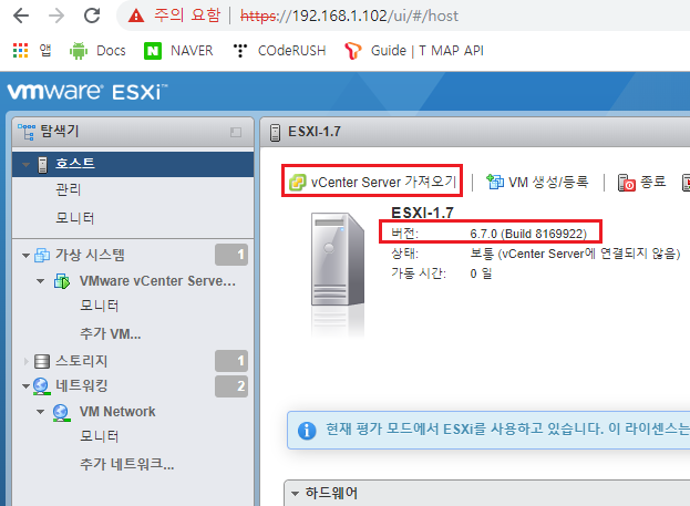 - ESXi 접속 -> vCenter Server 가져오기 -> VMware 사이트에 접속된다.