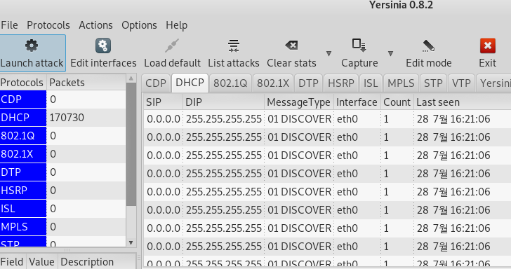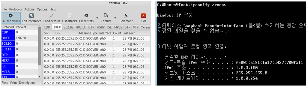 - 여기서는 Yersinia Tool을 이용하여 DHCP Server로 Discover 메시지를 계속 보내서 임대 가능한 IP를 소진시킨다.