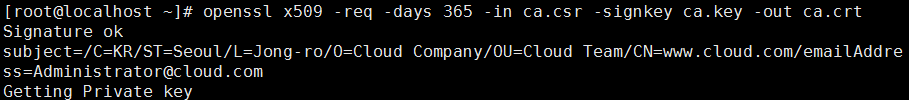 - # openssl x509 -req -days 365 -in ca.csr -signkey ca.key -out ca.crt: x509 인증서 생성