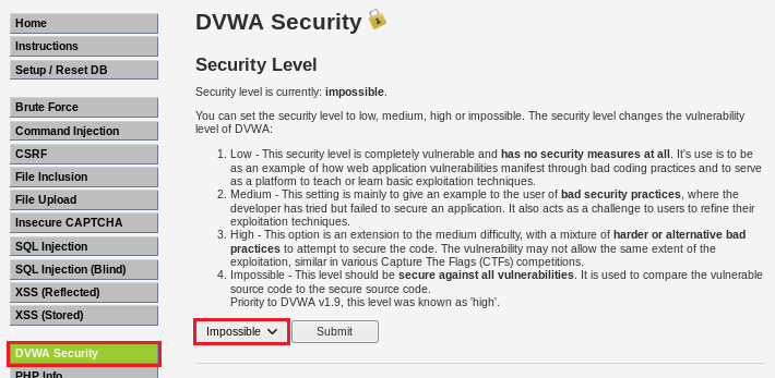- DVWA Security: 해당 부분에서 사이트의 보안 수준을 결정할 수 있다.