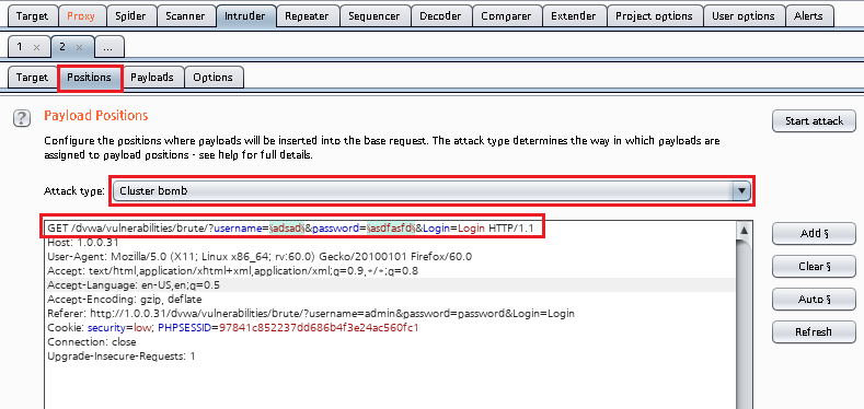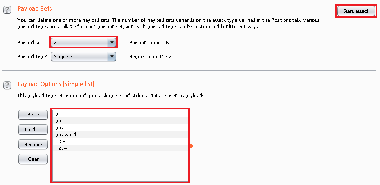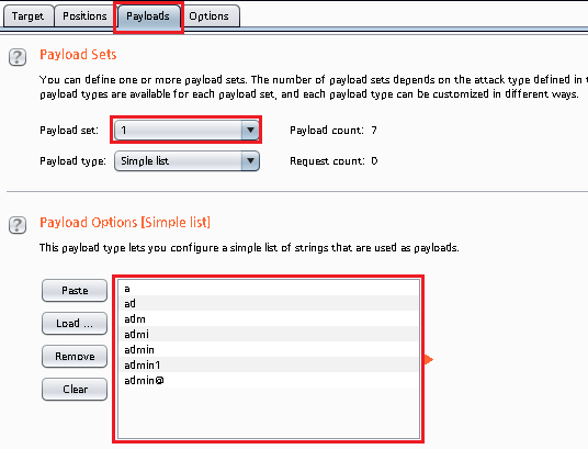 - "clear"를 눌러 초기화시키고, username과 password만 "add"를 눌러 Payload 추가
