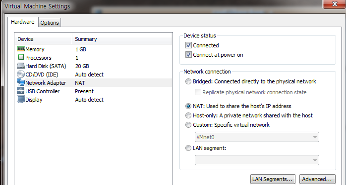 - 기본 네트워크는 Host-only로 설정되어 있다.