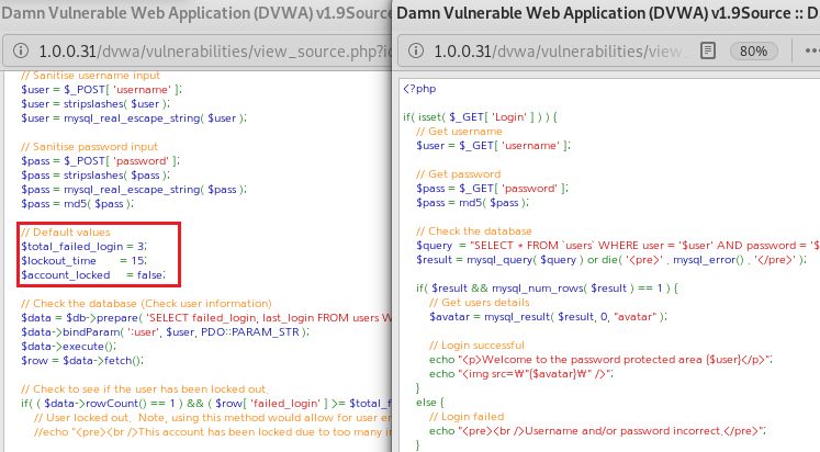 => Impossible에서는 Status가 200이 아닌 302로 나오는 것을 확인할 수 있다. Impossible에서는 여러 번 로그인 실패 시에 처리하는 코드가 들어있기 때문이다.