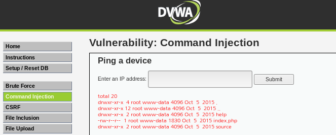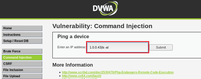 - "[IP] | ls -al" 입력, IP뿐만 아니라 or을 의미하는 "|"와 같이 명령어를 입력한다.