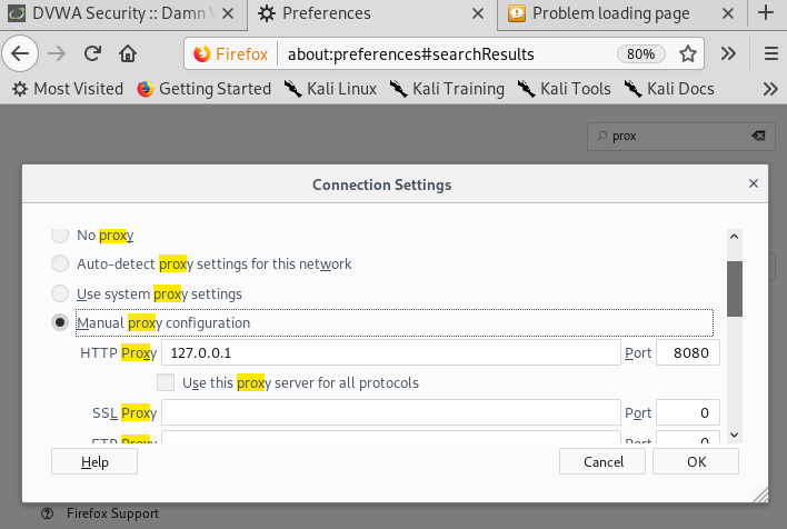 - 웹 설정 -> Proxy 설정 / Burp Suite를 사용하기 위해서 설정한다.