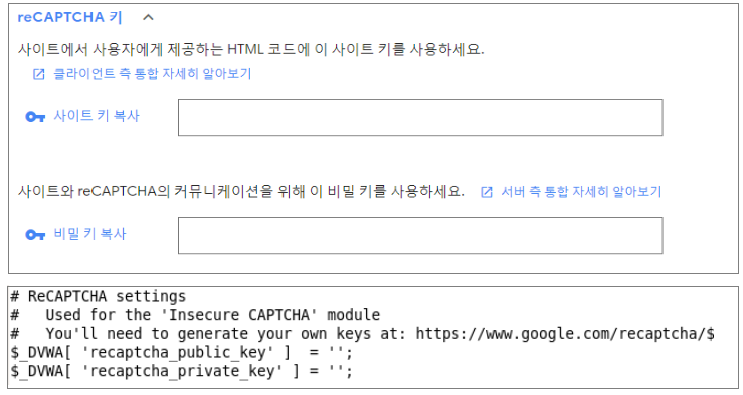 - 'recaptcha_public_key'에는 사이트 키를 복사, 'recaptcha_private_key'에는 비밀 키를 복사한다.